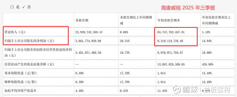 2025 年前三季度,海康威视实现营业收入 657.58 亿元,同比增长 1.18% 。归属于上市公司股东的净利润达到 93.19 亿元,同比增长 14.94%。单看第三季度,营业收入为 239.4 亿元,同比增长 0.66%,净利润为 36.62 亿元,同比增长 20.31% 。从这些数据可以直观地看出,海康威视在 2025 年整体保持着稳健的增长态势,尤其是净利润的增长幅度较为可观 ,显示出公司在市场竞争和内部运营管理方面取得了一定成效 。