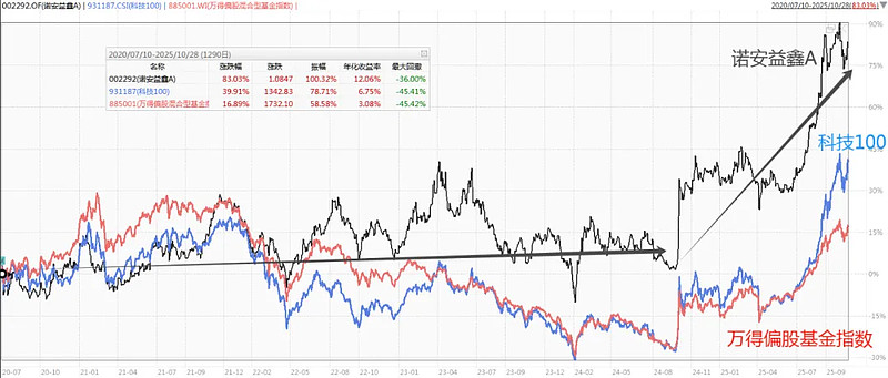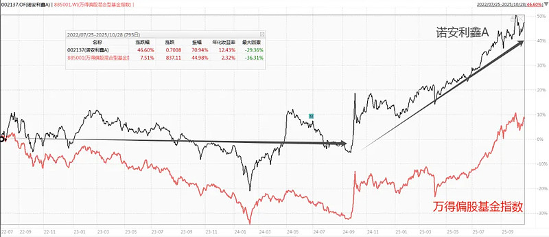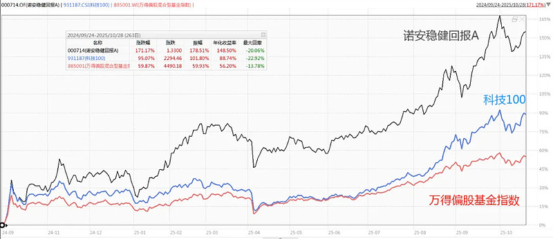 下图是她管理诺安稳健回报A去年924以来的业绩表现,在上涨行情中展现出极强的进攻性,收益率171.17%。(2023-9-24至2025-10-28 ,数据来源:Wind)