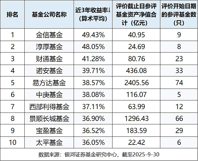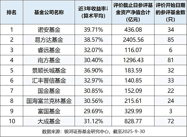 进一步翻看数据,筛选规模百亿以上的公司列表,如果只统计权益规模百亿级以上基金公司,诺安基金的近近三年权益基金算数平均收益率达39.71%排在第1名,力压许多老牌权益大厂。
