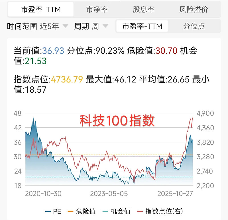 下图为科技100指数的估值和分位数变化,目前PE约37倍,处于近5年90%的分位数。(截至2025-10-28,数据来源:Wind)
