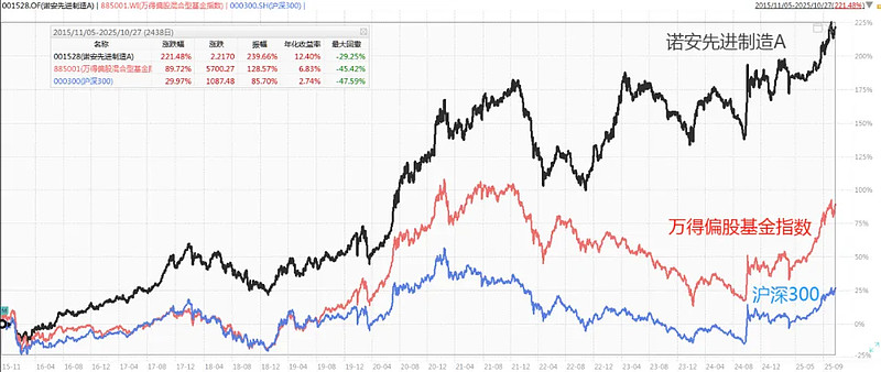 韩冬燕在2015年11月的市场高位接任诺安先进制造,至今依旧取得了12.4%的年化收益率。到11月初,年限就满10年了,意味着她也将成为新晋“双十基金经理”。(2015-11-06至2025-10-27,数据来源:Wind)