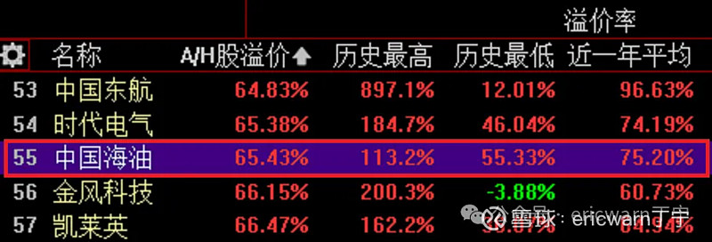 如果不看恒生AH股溢价指数,而是看回到个股,AH溢价率的波动就更大了。以笔者重仓的中国海油为例,历史最高113.2%、历史最低55.33%、近一年平均75.20%、现值65.43%。历史最高的那个数据,是中国海油A股刚上市创造的,那时的股价很妖,没啥参考意义,所以笔者主要会用另外三个数据做做文章。