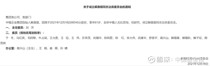 中共党员、中植企业集团创始人解直锟先生,因心脏病突发抢救无效,于2021年12月18日9时40分在北京逝世,享年61岁。