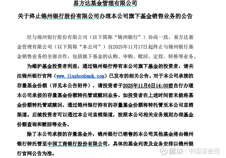 11月3日,易方达基金发布公告称,经与锦州银行协商一致,公司自2025年11月17日起终止与锦州银行基金销售业务的全部合作,包括旗下基金的认购、申购、赎回、定投、转换等业务。