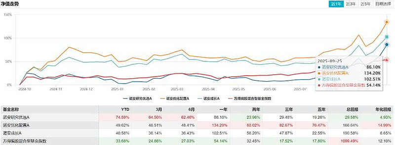 截至9月24日,诺安优化配置以近一年134.39%的收益率表现最佳,诺安成长和诺安研究优选也分别交出了103.78%和87.63%的出色成绩单。