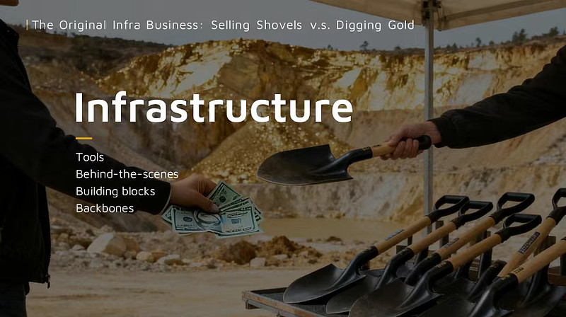 什么意思呢?打个比方,有些人喜欢去淘金,但有些人就只想卖铲子。卖铲子听起来是件很low的事,但是很多时候淘金这件事往往不容易看清楚。并且,因为淘金这件事看起来很光鲜,会有很多人去做,壁垒反而没那么高。而如果你把铲子卖好了,有可能是一个更好的商业。
