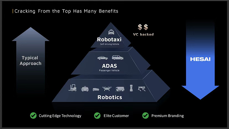 但是,禾赛当时不愿意这么做,因为如果这么做,最开始做出来的技术就没有去探索技术的边界。所以,我们反其道而行,从上往下做,好处就是:一开始做的就是最领先的技术,服务的也是行业最厉害的客户,企业品牌也是基于全世界最好的客户去建立的全球品牌。