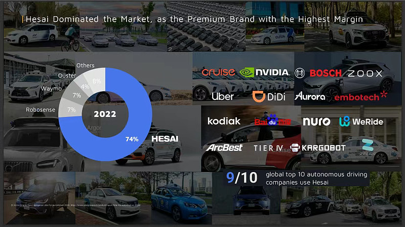 这是2017年。但是差不多两三年后,禾赛通过做最好的产品技术,服务最好的客户,占据 74%的全球市场份额。全球十大自动驾驶公司有9家采用了禾赛的激光雷达。