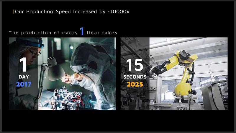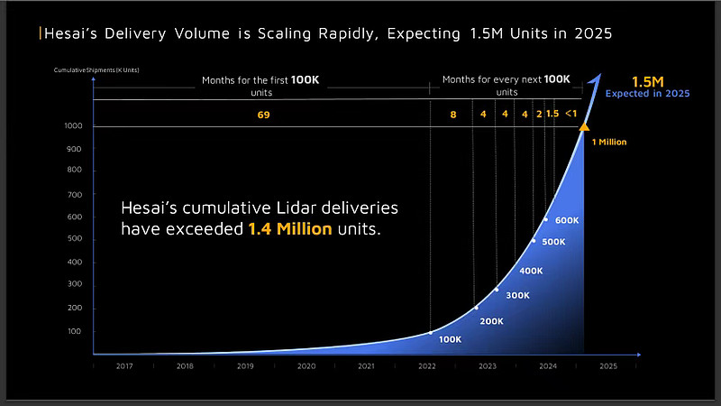 当把质量、性能,尤其是和成本打通以后,结果当然是令人满意的。禾赛前十万台激光雷达花了69个月才做出来,现在每个月产能都超过十万台,今年我们要生产100多万台。在过去的每一年,禾赛的产能都在翻番。大家可以看到,从质量到性能最后到成本的环节打通后,就可以充分地赋能行业。