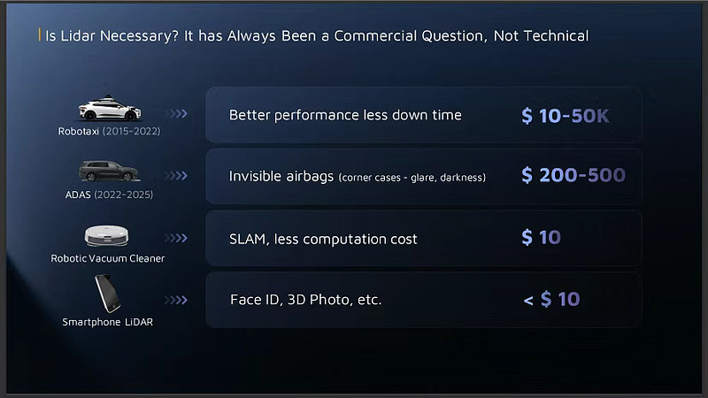 我认为,我怎么看不重要,应该看的是一个行业最终解决了多少问题。比如说,车上装激光雷达更安全差不多已经成为一个共识。那么,扫地机上为什么要装激光雷达呢?扫地机又不会撞死人。但其实不应该这么想,你应该想的是扫地机上的激光雷达创造的价值和成本分别是多少。如果考量的核心是价值优先,那就应该用激光雷达;如果是价格优先,那就可以不用。
