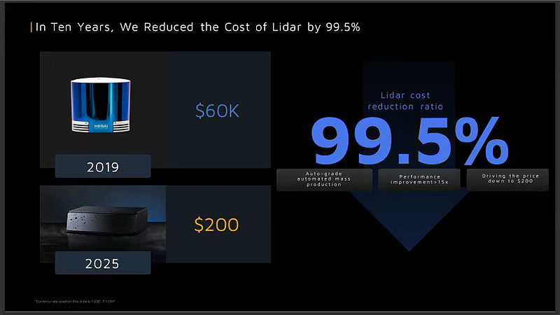 禾赛在过去的七八年间,推动了整个激光雷达行业的成本降低了99.5%。从客户角度讲,这是一件非常好的事;但从投资人角度讲,他会认为禾赛真是个神经病。为什么要把一个行业成本价格降到99.5%?但,我们认为当行业达成共识的时候,作为基础设施的建设者,我们就有义务降本就有义务把激光雷达做成白菜价,否则没法大量普及。