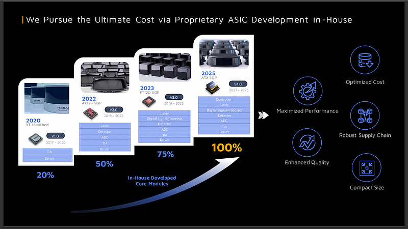 苹果、特斯拉,甚至比亚迪都是这么干的,所以,禾赛从2017年开始做芯片,每年都会投入更高的比例。禾赛核心的技术会从外部供应商变成自己。这件事其实是非常残酷的,因为每年要投好多亿元去做这件事,并且要持续去做,还得看得准。因为如果芯片化,但是产品卖不动,就造成巨大的浪费。但如果芯片化成功,就可以把激光雷达做小、做便宜、做高性能,甚至在供应链上会做得更好。