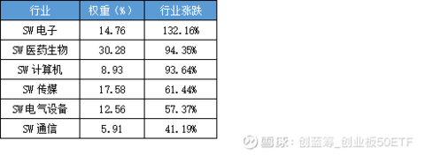 从行业层面来看,创业板50指数的前五大权重行业分别为:医药生物、传媒、电子、电气设备、计算机,市值占比分别为30.3%、17.6%、14.8%、12.6%和8.9%。