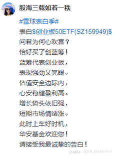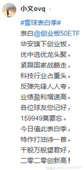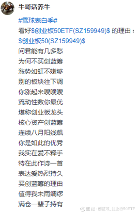 从市场认可度来看,虽然细分的科技类指数如半导体50等近期的高涨幅吸引了大部分投资者的眼球,但从雪球网站近期流行的表白活动来看,创业板50的粉丝还是很多的,而且都是才华的铁杆粉,下面我们筛选了一些用诗词表达对创50的爱和未来期盼的粉丝表白,简直太有才了!