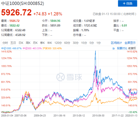 那么哪个指数才是小盘股集中营呢?这就是我们今天要介绍的$中证1000(SH000852)$指数了。