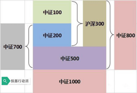 上面提到的中证800指数,其实就是沪深300+中证500构成的指数,而沪深300又可以进一步拆分成中证100和中证200指数,上图中的指数从上到下对应的成份股市值也是由大到小排列的。
