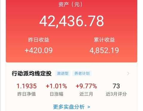 接着看行动派均线定投实盘组合情况,昨日组合净值是1.1935,昨日涨幅为+1.01%,再创新高,意味着之前任何时刻跟投的小伙伴都是赚钱的。