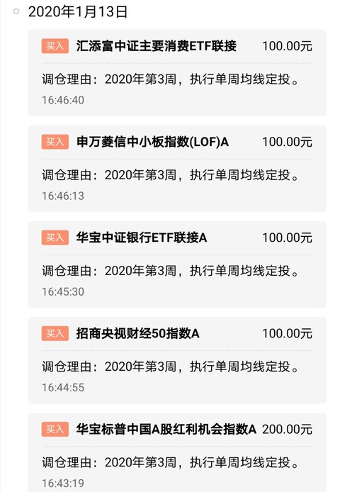 今天是2020年第3周的周二,按计划执行单周均线定投,买入红利机会、央视50、中证银行、中小板指、主要消费等5只基金,本次合计投入600元,按每周投入1000元计,本次投入后合计结余资金3020元,结余资金的用途后续再说,如果没机会用就拿着^_^
