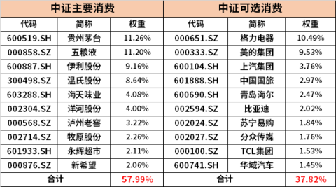 1、 从前十大重仓股的权重来看,中证可选消费集中度低于中证主要消费,并且两者前十大重仓股中无一股票重合。