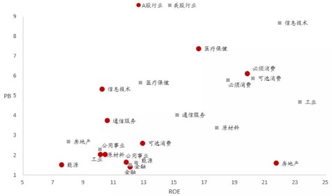 ROE这个指标稍微关键一些,下图为A股和美股的PB-ROE对比,A股科技板块的ROE显著低于美股↓考虑到我们的科技、医疗目前都处于大力研发阶段,资本开支较大,等我们以后站稳了脚跟,有了竞争优势,开支会缩减、成本会降低,ROE就会上来。