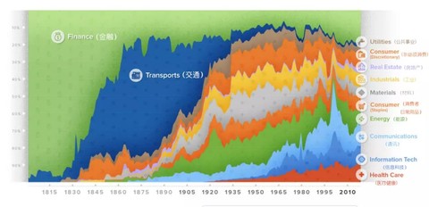 下图是美股两百年来行业结构变迁,曾经美国也是金融和交通占比巨大。近几十年通信、信息科技和医疗健康是增幅最大的行业!